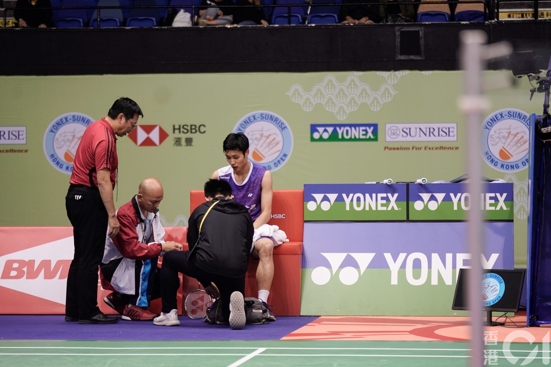 周天成在比賽中一度接受場邊治療, 膝蓋磨破皮流血